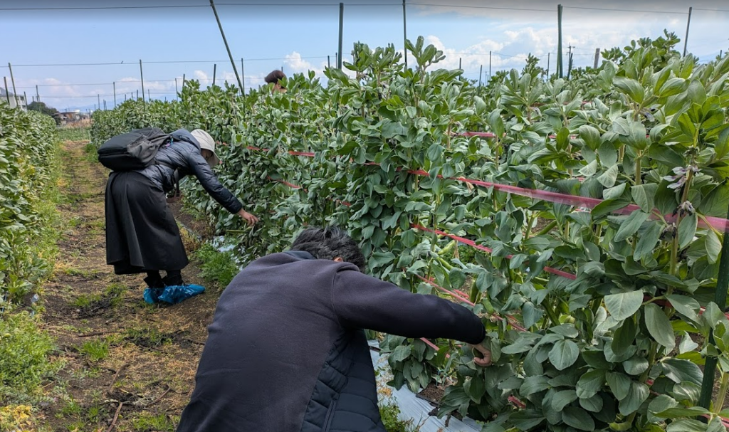 ツアーのはじまりは、指宿市の特産品「そら豆」の収穫体験です。参加者は土の感触を楽しみながら、生産者と直接言葉を交わし、丁寧にそら豆を収穫しました。