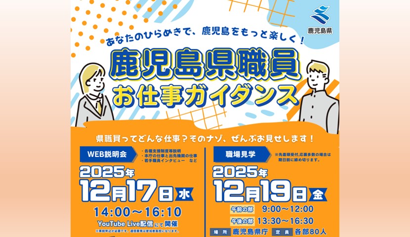 | 開催場所 | WEB説明会:オンライン開催(YouTube Live配信),職場見学:鹿児島県庁 |