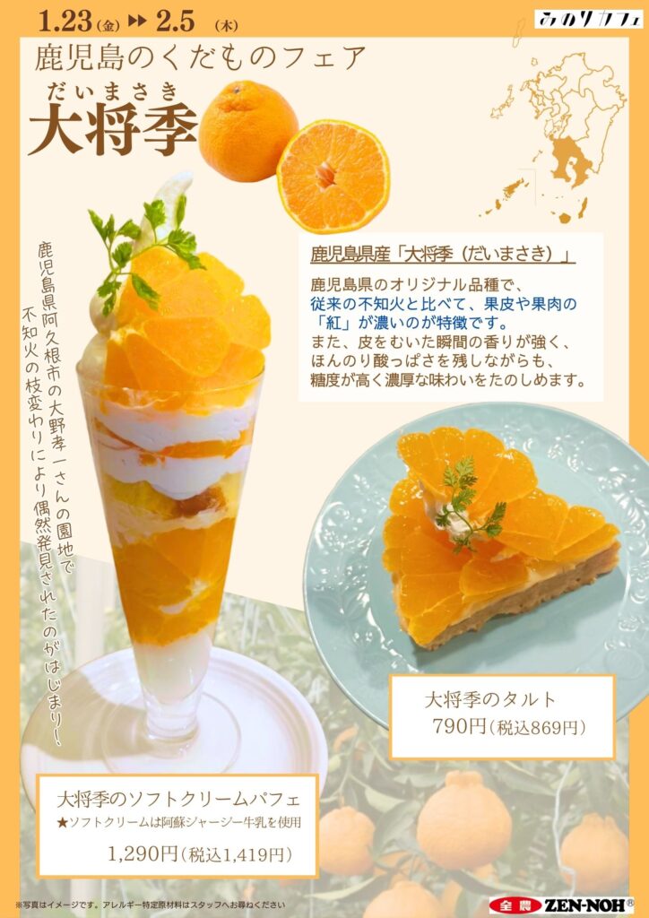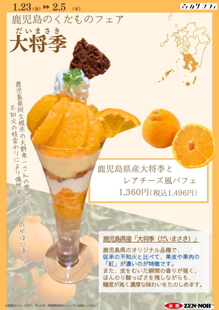 かごしまブランド産品で,鹿児島県のオリジナル品種である「大将季」をPRするため,福岡市内のJA全農直営「みのりカフェ」2店舗で,鹿児島のくだものフェア第二弾として「大将季フェア」を開催します。
