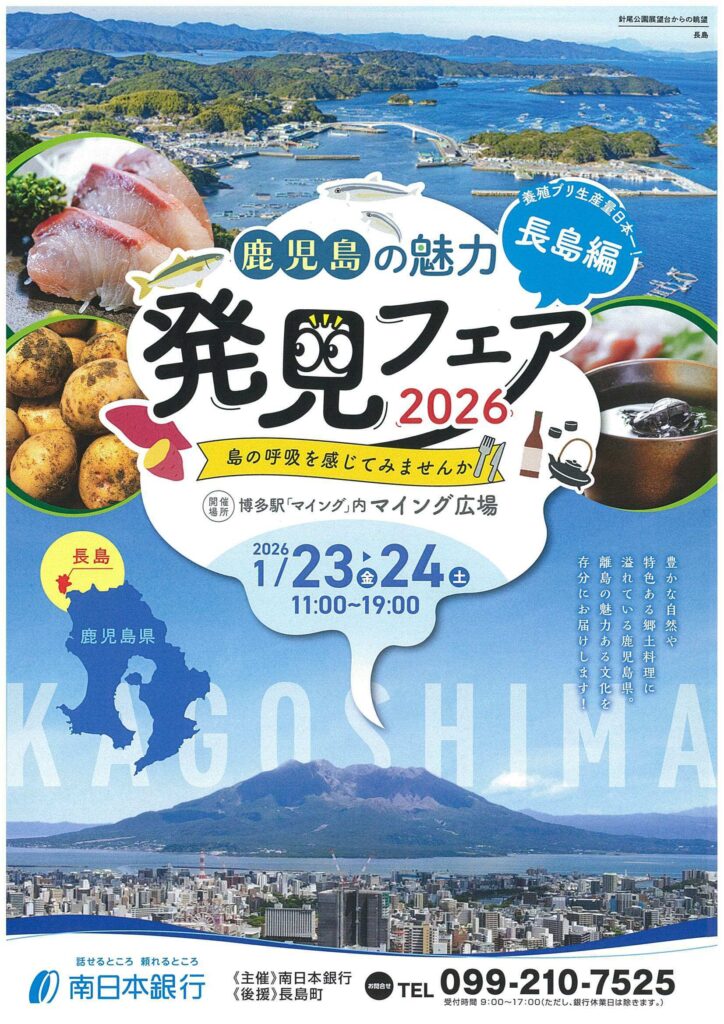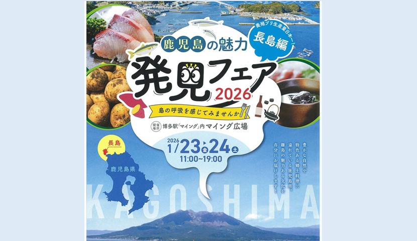 鹿児島の魅力ある資産を県外の皆様へお知らせし,特産品の消費拡大,観光客誘致の促進,U・Iターン支援を行うため,九州の玄関口博多駅コンコースに直結した商業施設内(マイング)のオープンスペースにおいて,『鹿児島離島の魅力発見フェア2026~島の呼吸を感じてみませんか~』を開催します。