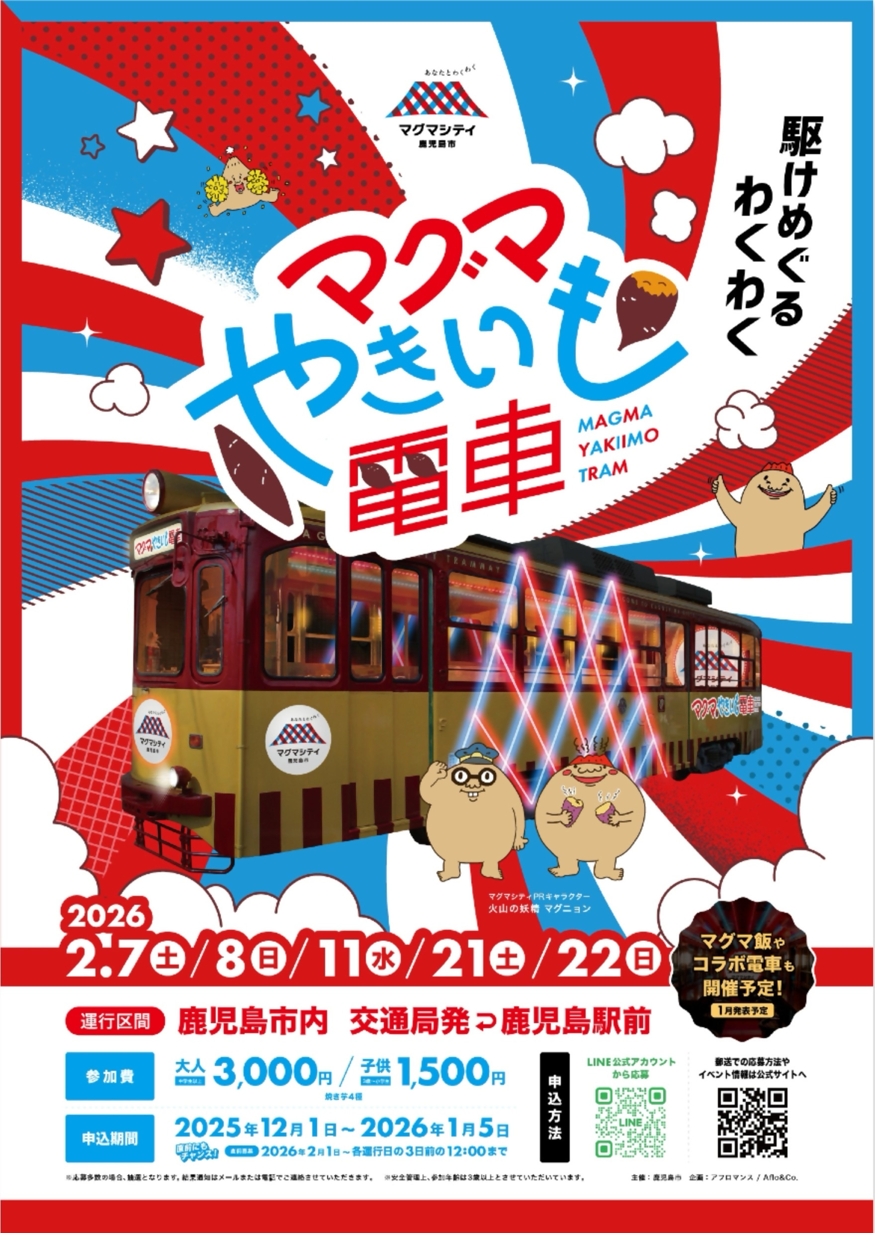 「マグマシティ」カラーの赤と青のLEDで光り輝く市電(カフェトラム)に乗り、4種類のやきいもを食べ比べながら、市街地の街並みを楽しめる体験型のイベント「マグマやきいも電車」の参加者募集が始まりました!
