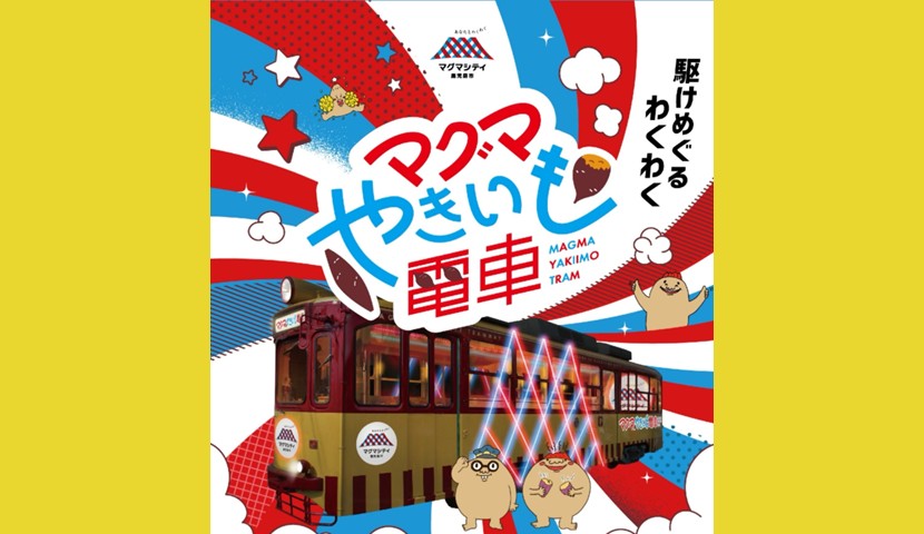 「マグマシティ」カラーの赤と青のLEDで光り輝く市電(カフェトラム)に乗り、4種類のやきいもを食べ比べながら、市街地の街並みを楽しめる体験型のイベント「マグマやきいも電車」の参加者募集が始まりました!