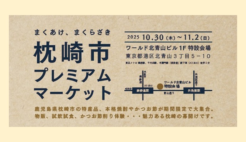 薩摩焼酎やかつお節など、鹿児島県枕崎市の特産品が期間限定で大集合!また、枕崎市、枕崎水産加工業協同組合、薩摩酒造株式会社、Dashi Corporation株式会社の各代表者によるトークイベントも開催されます。