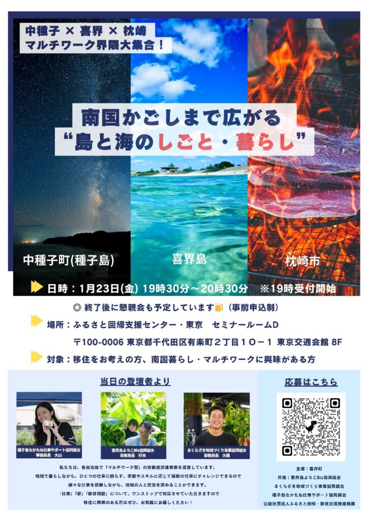喜界町,枕崎市,中種子町で運営されています「特定地域づくり事業協同組合」の職員が,地域で暮らしながら,ひとつの仕事に限らず,季節やスキルに応じて複数の仕事にチャレンジできる「マルチワーク」と呼ばれる働き方をご紹介するトークイベントを開催します。